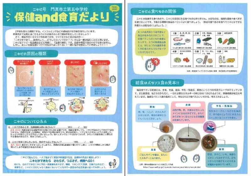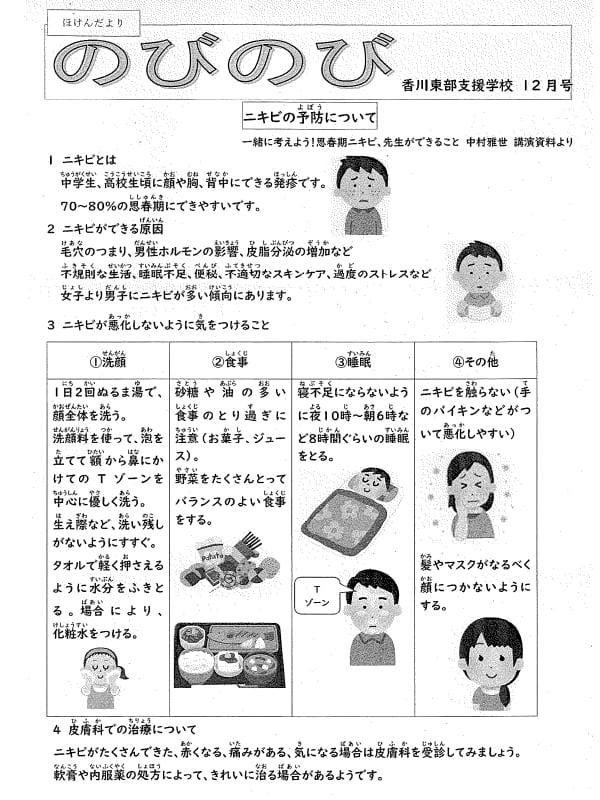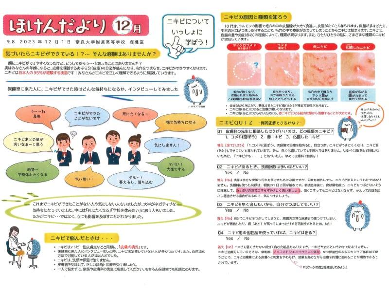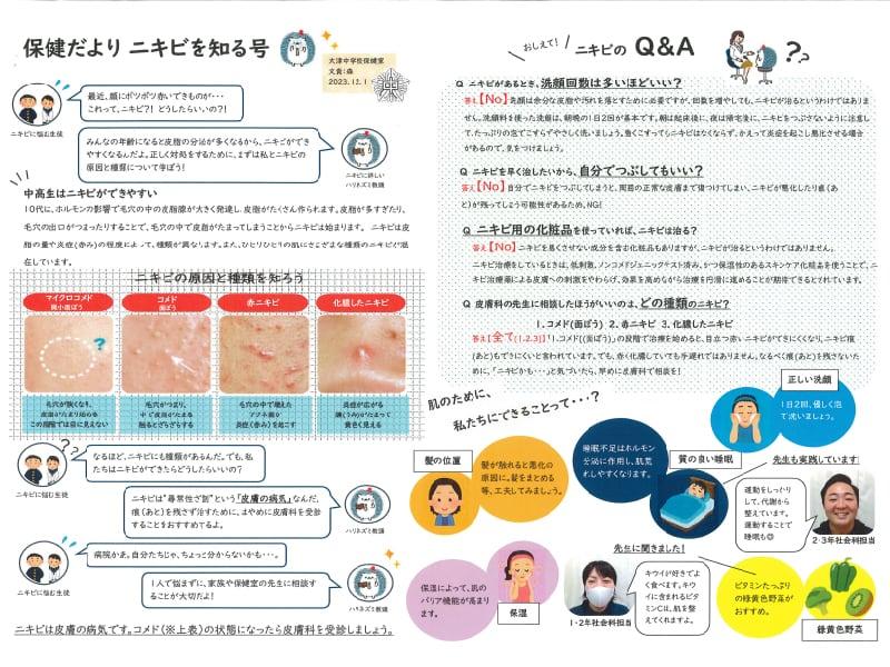 肌の悩みやニキビについて相談に来る生徒がいたり、ニキビがあることでマスクをはずせない生徒がいたりしたそうです。今回、養護教諭と栄養教諭の先生が協力し、ニキビについての正しい知識と自分でできるニキビケアを知ってもらうために制作されました。