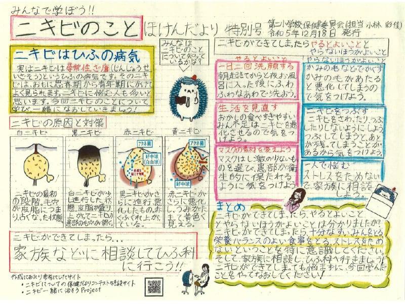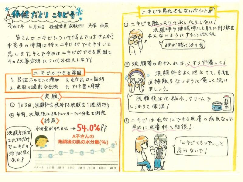 ニキビの原因と対策がしっかり情報提供できている点が高く評価されました。ニキビができてしまったら、「やるとよいこと」「やらないほうがよいこと」はわかりやすくて誰もが必要な情報です。掲示板に掲示し、多くの児童が読む機会を設けたということです。