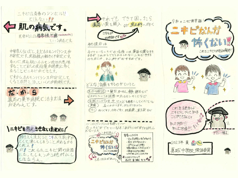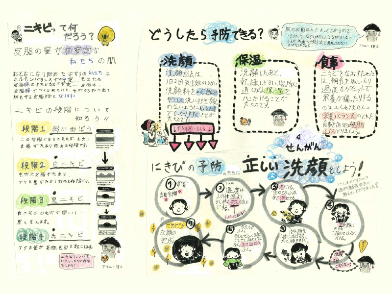 事前に、調べ学習を行い、専門医に来校いただき講話と洗顔などの実技指導をしていただき、パンフレットの作成に取り掛かったとのこと。内容も、ニキビの悩みを解決するための基本の知識や予防方法・治療について正しい情報提供がなされています。